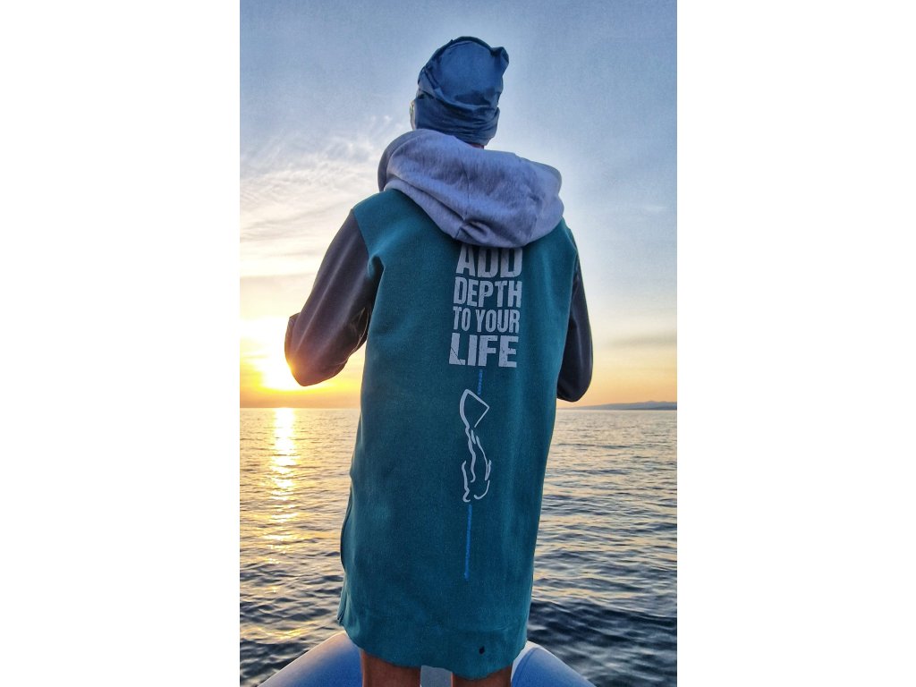 Slovo Martina : „Už roky cestuji po světě v dlouhých mikinách vlastní výroby. Oceňuji jejich praktičnost – snadno se v nich převléknu, netáhne mi na záda a mám svůj osobní prostor. Rozhodli jsme se vyrábět je v Čechách i pro vás. Přidal jsem heslo „ADD DEPTH TO YOUR LIFE“ se siluetou freedivera a slogan „GO DEEP OR GO HOME“, který odráží filozofii freedivingu.“
